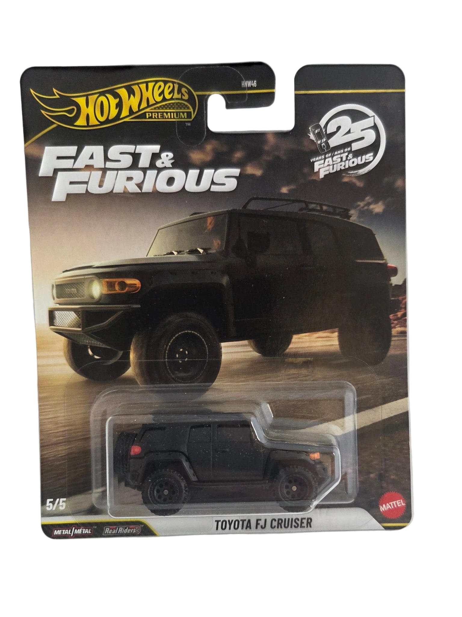 The Hot Wheels Fast & Furious Toyota FJ Cruiser 25th Anniversary is a diecast toy vehicle part of the popular Fast & Furious series by Hot Wheels, showcasing a matte black color and the iconic design of the Toyota FJ Cruiser. Item is new